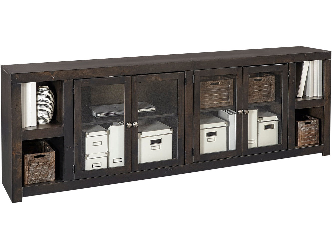 The 97" Console from the Avery Loft Collection boasts a sleek Ghost Black Finish and 4 convenient doors. Expertly crafted, this console is the perfect addition to any space, providing both style and functionality. Elevate your decor with this sophisticated piece.