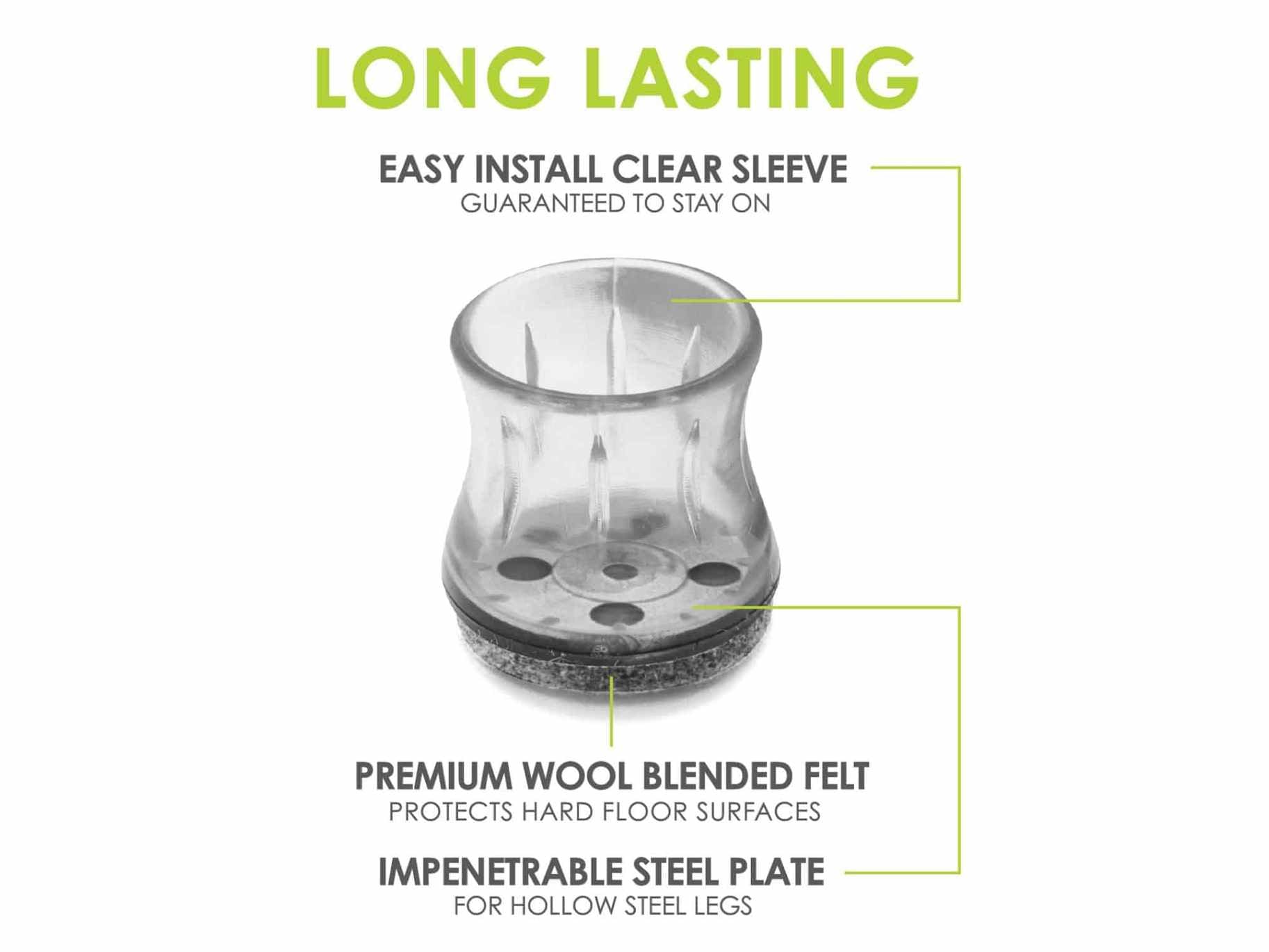 - Durable outer sleeve:The Slipstick Clear Sleeve felt chair glides come with a sturdy outer sleeve that keeps them securely attached to your furniture legs and feet, preventing them from coming off.